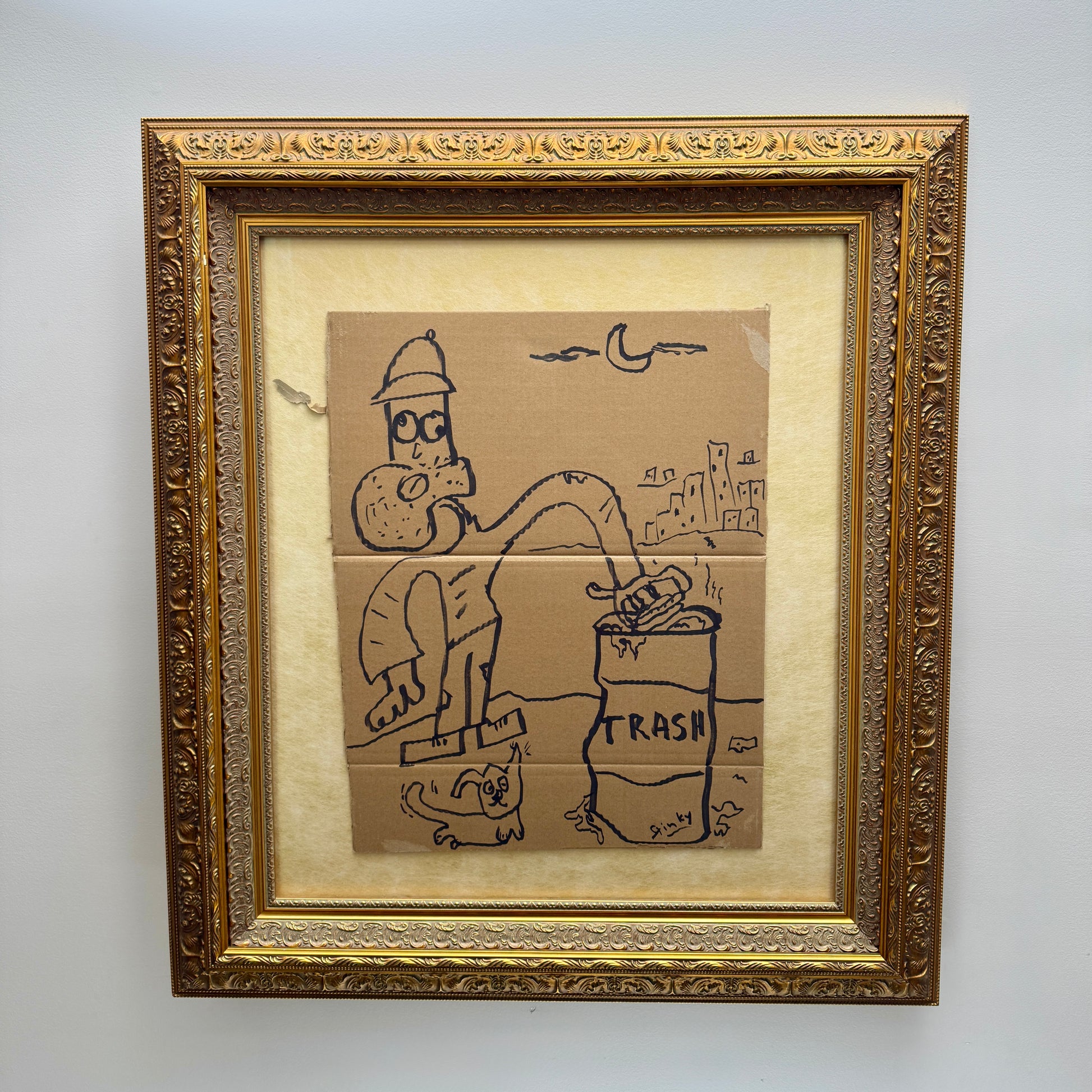 Black marker on cardboard.