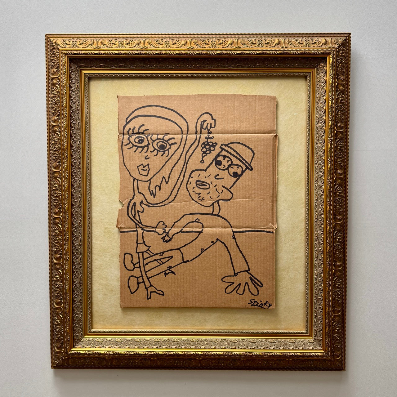 This work distills intimacy into gesture. The exaggerated limbs and elastic posture create a sense of physical imbalance, while the figures’ wide, searching eyes suggest emotional vulnerability beneath the surface playfulness. The grapes—suspended above like a symbolic fruit—operate as both focal point and metaphor, echoing classical references to temptation while remaining rooted in the artist’s raw, contemporary visual language. The cardboard surface, with its creases and imperfections, adds warmth and history, reinforcing the sense that this moment is fleeting yet deeply human.