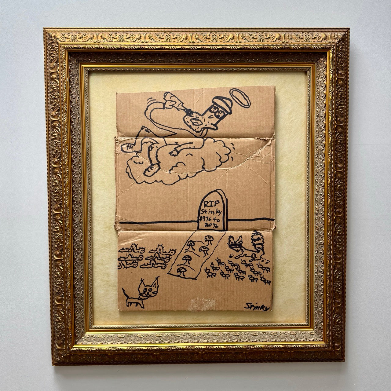 What elevates this piece is its tonal complexity. It refuses solemnity without dismissing gravity. The humor softens the existential theme, but the symbolic structure—halo, gravestone, procession of creatures—carries genuine weight. The cardboard’s creases and wear deepen the narrative, reinforcing the passage of time and impermanence. Rather than presenting death as an end, the artist frames it as transition—both spiritual and ecological. This is fine art that merges satire and sincerity, confronting mortality with wit, imagination, and unexpected tenderness.