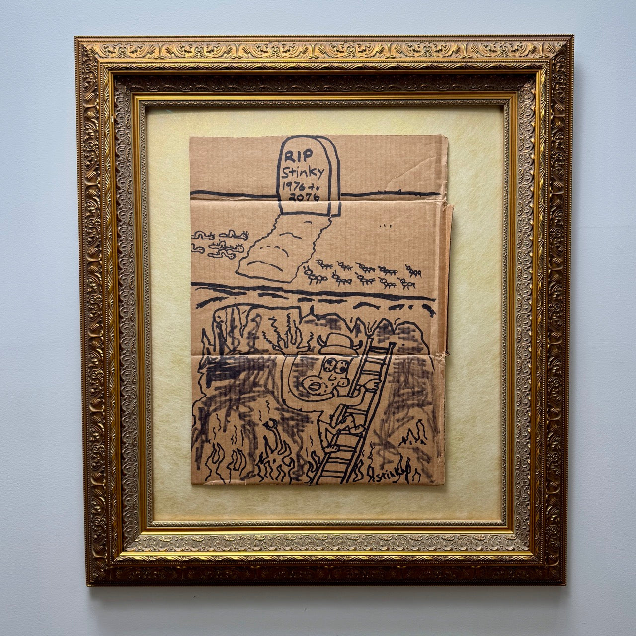 A gravestone marked “RIP Stinky 1976–2076” looms above while, beneath the surface, Stinky desperately climbs a ladder from a fiery pit. Stinky Digged a Hole He Can’t Climb Out Of captures the darkly comic tension between consequence and hope—where humor meets hard truth.