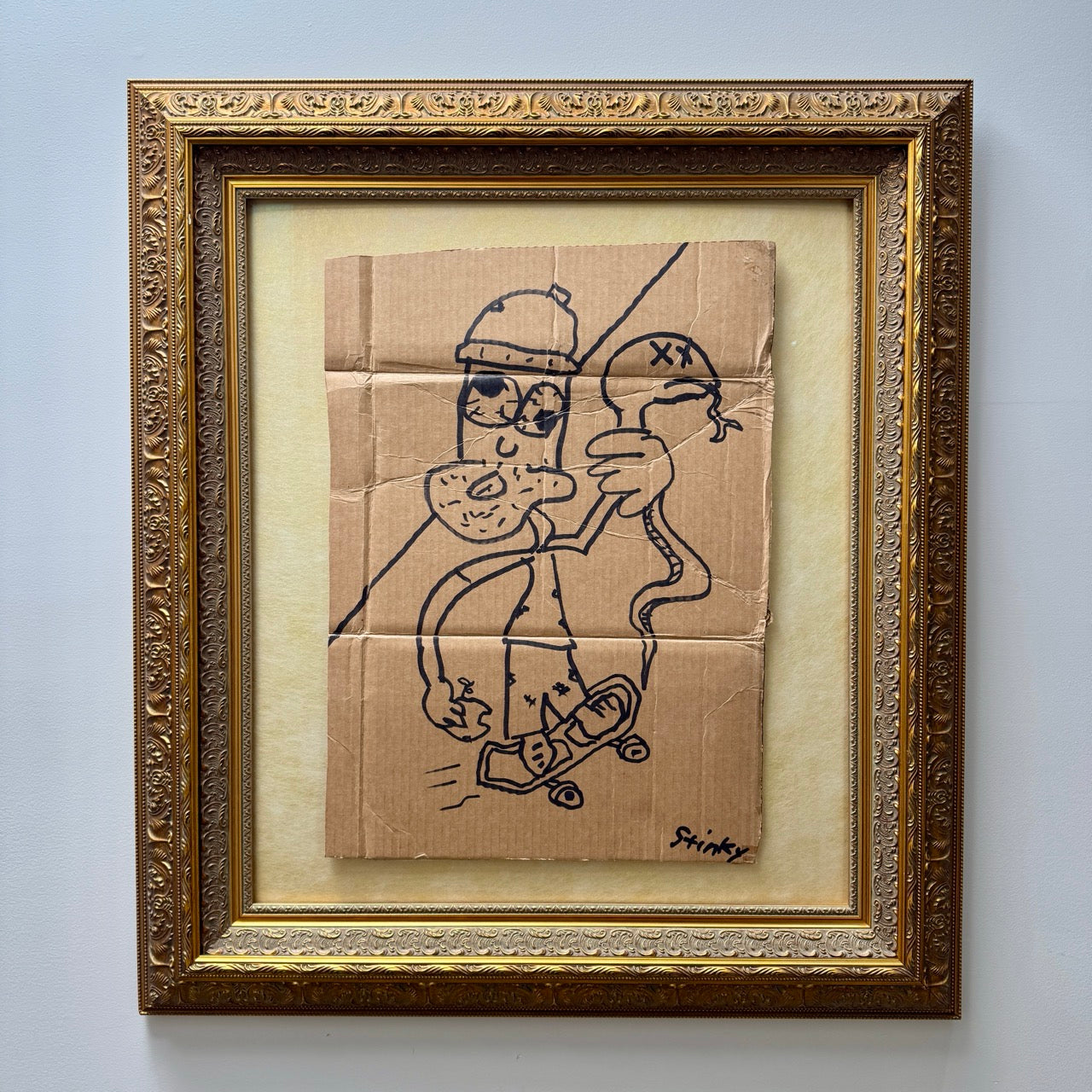 The composition is driven by diagonal energy, with Stinky’s body and skateboard creating a forward thrust that contrasts against the dangling curve of the snake. The snake’s slack form introduces gravity and stillness into an otherwise kinetic scene, while the bitten apple becomes a subtle but powerful focal counterpoint—small, deliberate, and loaded with implication. The linework remains economical yet expressive, allowing gesture and posture to carry meaning. The cardboard’s creases cut through the figure like visual fault lines, reinforcing tension between action and consequence, movement and reflection.