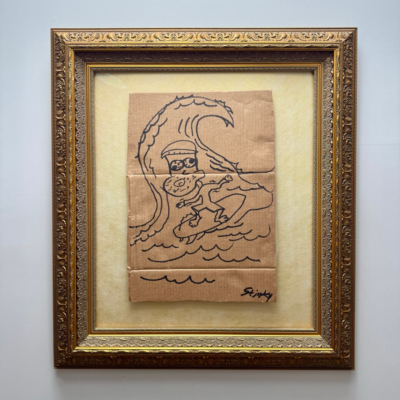 The composition is dominated by the dramatic arc of the wave, which forms a natural frame around Stinky and pulls the viewer directly into the action. The linework is confident and economical—each stroke serving both structure and motion. The wave’s curling crest creates a sense of imminent collapse, while Stinky’s stance, slightly off-balance yet committed, introduces tension between control and surrender. The cardboard’s creases subtly echo the wave’s curvature, reinforcing movement while grounding the piece in its raw, physical material. The minimal rendering of water below contrasts with the intensity above, giving the scene both weight and breath.